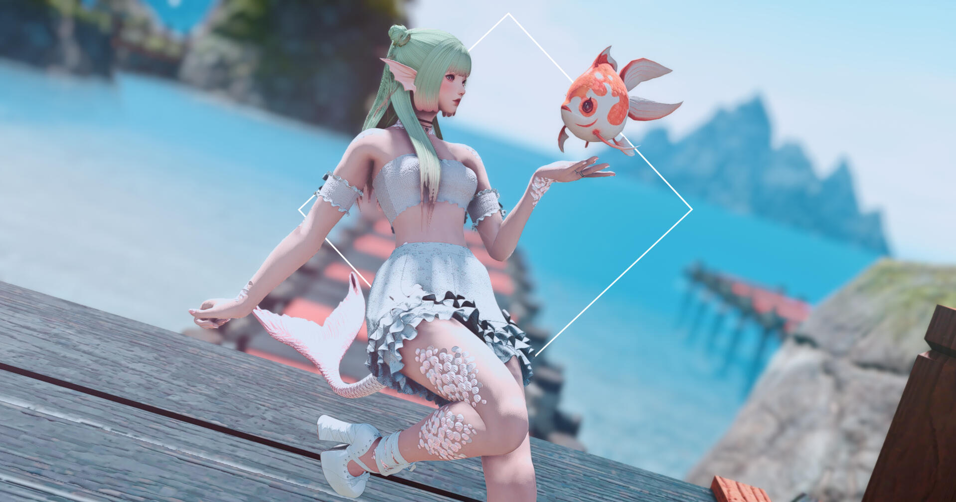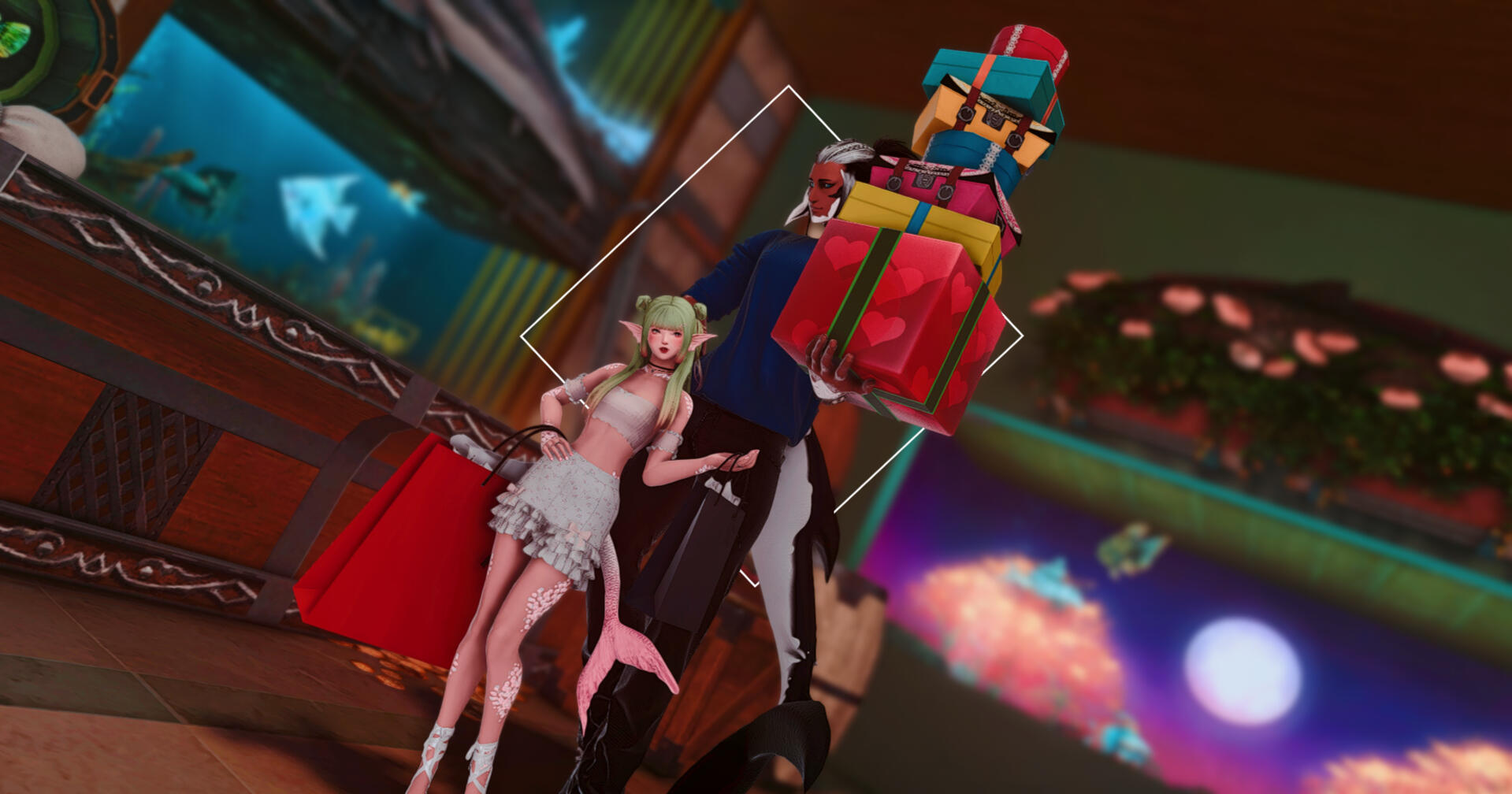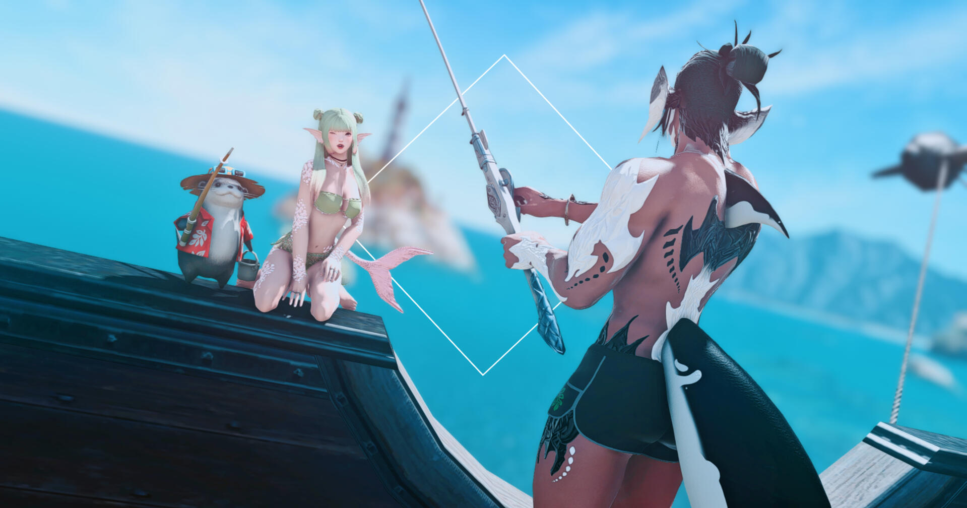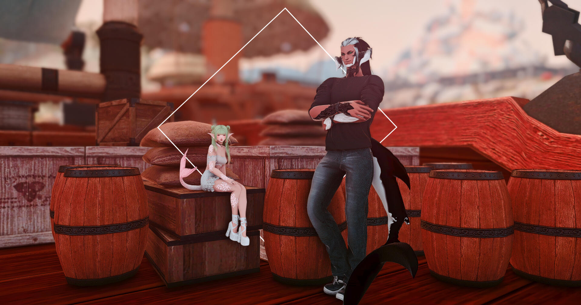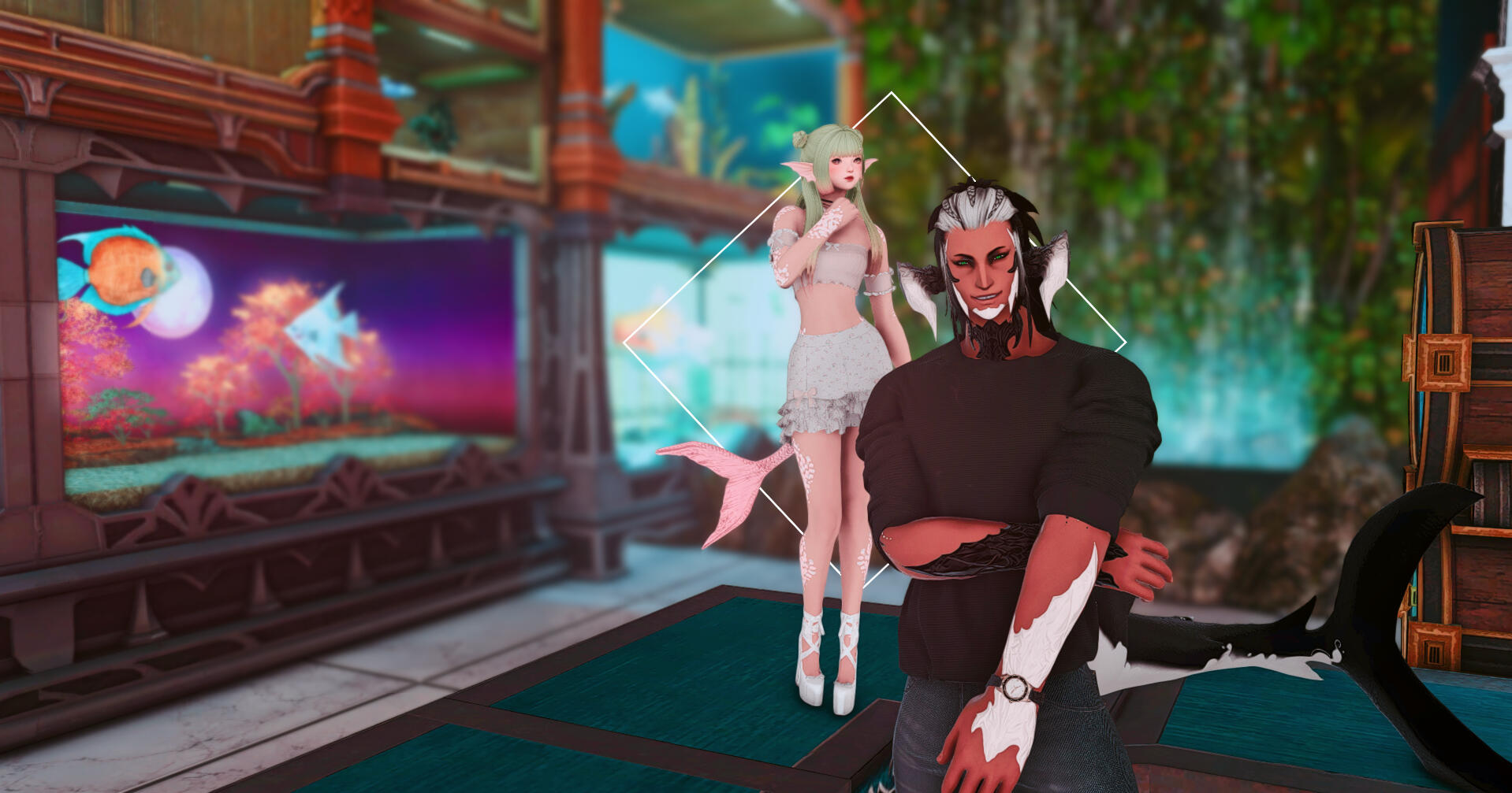 Hailing from the Ruby Sea, Siren and Swim moved to Eorzea soon after the Garlean occupation began. While their bond was forged through the mutual loss of their homeland, their fondness for the sea and its endless bounty has never wavered. When Mistress Yugiri ferried Doman refugees to Uldah, they quickly found work plying their craft, and within a few months had opened a small little shop to peddle their humble wares.Their operation is small but they hope that in time people from all over Eorzea will come to know and enjoy their little establishment. Swim has a bad habit of being one-minded about whatever he’s currently focused on, but Siren is always there by his side to ground him and make sure he’s staying on task.More often than not they can be found on the rolling waves of the azure oceans hunting for new merchandise to sell to any would-be fishermen. If you have the time, stop in and see what they have available! If nothing else you might manage to get a laugh or two from watching their antics.